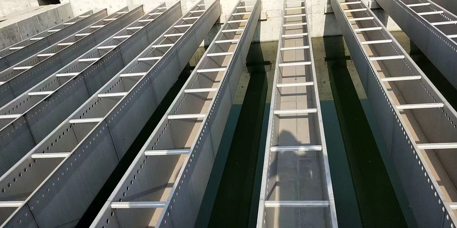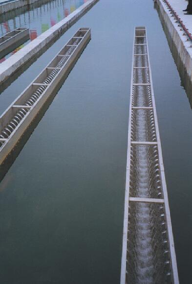 1、集水槽是净水厂和污水厂用来均匀收集溢面清水的关键设备,也是水厂一道亮丽风景线。集水槽主要有以下各方面应用:平流沉淀池出水端采用条形孔式或堰齿形集水槽、斜管斜板沉淀池表面均匀布置集水槽、机搅澄清池采用环形槽或配置辐射槽、污水厂终沉池采用圆形集水槽。
