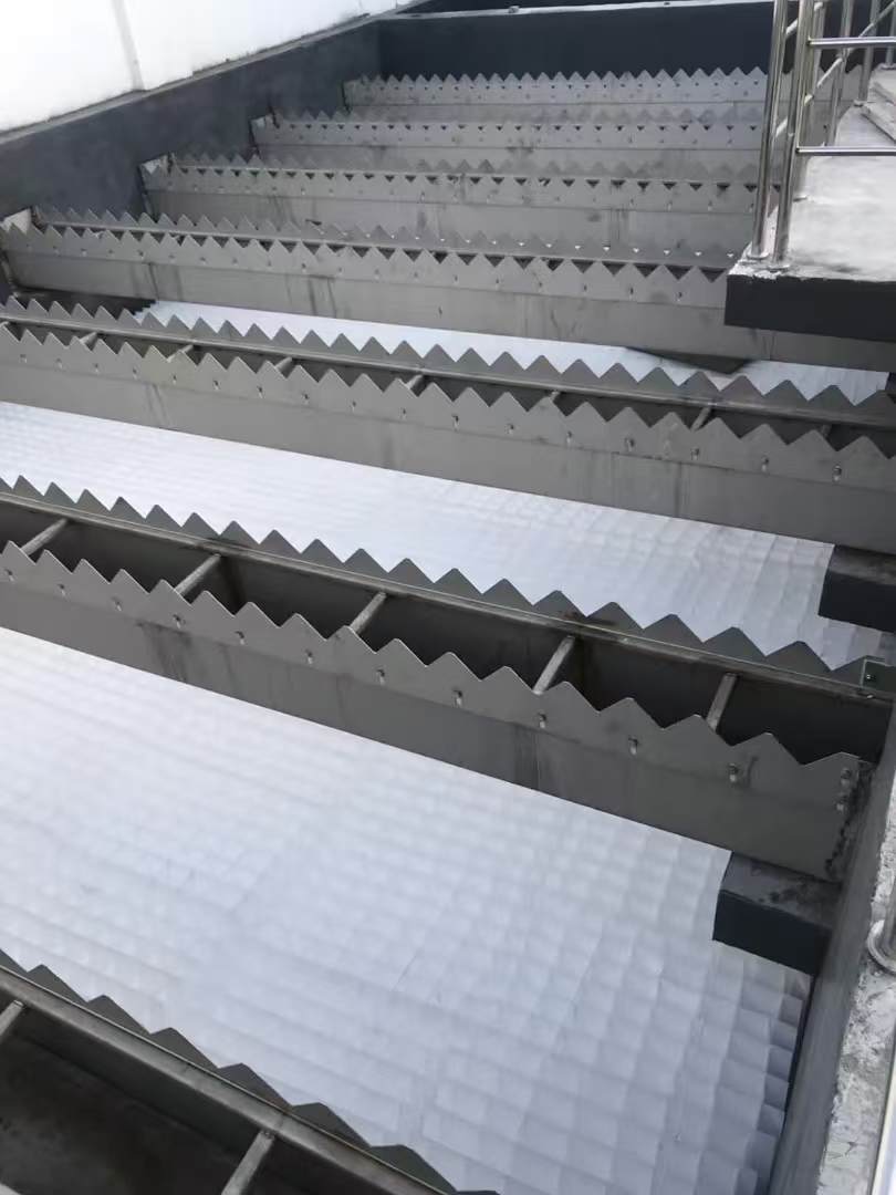 齿形集水槽两侧采用齿形堰板与槽体侧板拼装而成,拼装孔为囊形具有可调性,堰齿角度90°,堰齿大小一般有80X160、100X200两种形式,集水槽厚一般采用4~6mm。