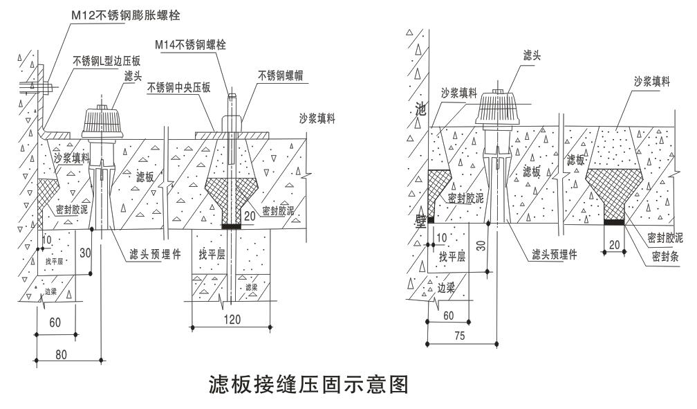 1、先找平滤梁或支墩并清理池中杂物。 2、吊放滤板定位。 3、板缝密封施工。 4、压固不锈钢压板并拧入滤头。 5、试水(气)。 6、正常后投运。